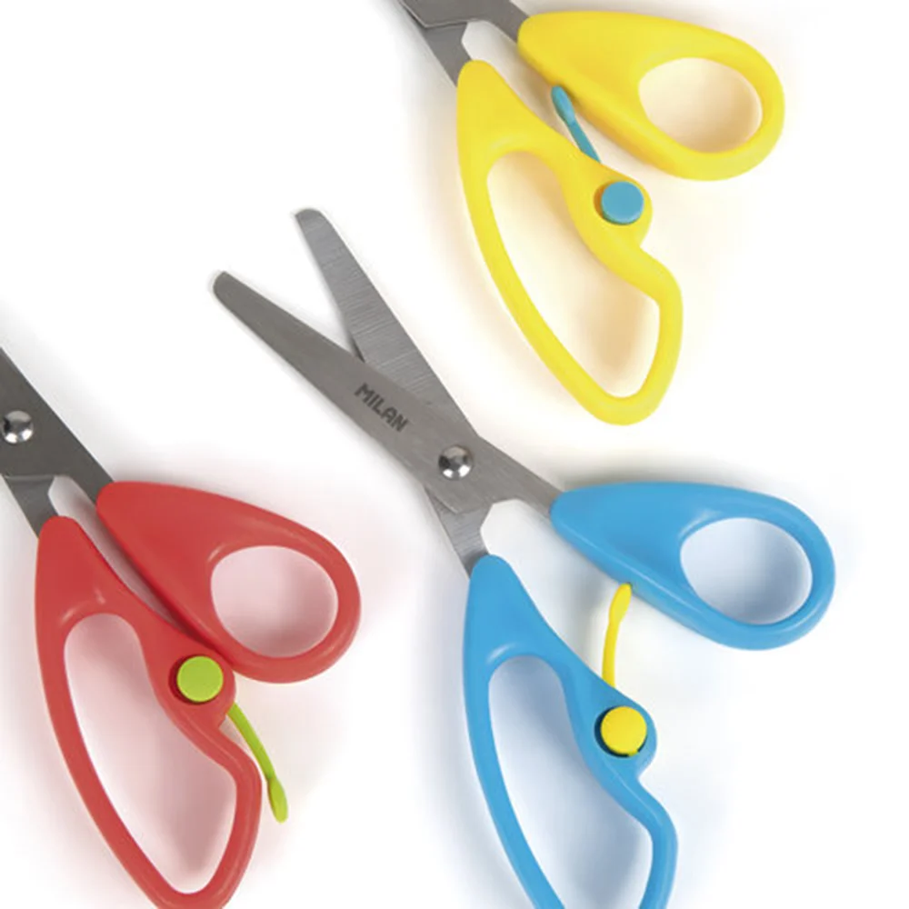 La tijera infantil Milan con retorno utiliza una palanca plástica entre las dos empuñaduras, que, al doblarse y crear tensión, devuelve automáticamente la tijera a la posición abierta después de cada corte. Este mecanismo facilita el uso para los más pequeños, permitiendo cortar durante más tiempo con menos esfuerzo. Cuenta con hoja de acero inoxidable, punta redonda y mango ergonómico y seguro para manos infantiles, siendo ideal para manualidades y aprendizaje escolar.