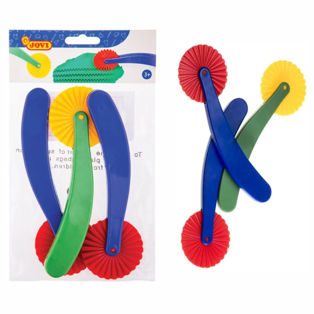 Descubre el pack de 3 cortadores para plastilina Jovi en forma de rueda con corte zigzag, ideales para dar forma, textura y creatividad a tus modelados. Perfectos para plastilina y pasta de modelar, estos cortadores permiten realizar bordes decorativos y originales. Fabricados en plástico resistente, son fáciles de usar y seguros para niños. Impulsa la imaginación y añade acabados únicos a todas tus creaciones escolares o artísticas.