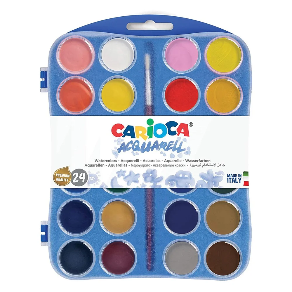 Las acuarelas Carioca destacan por sus pastillas de 30 mm. de diámetro, más grandes que las estándar, ofreciendo mayor duración y superficie de color. Disponibles en sets de 12 y 24 tonos luminosos, son perfectas para pintar con intensidad y disfrutar de mezclas suaves. Ideales para uso escolar o creativo.