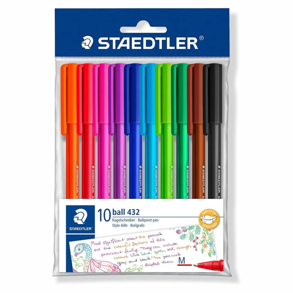 Descubre el pack de 10 bolígrafos Staedtler de colores surtidos. Su trazo fino de 0,3 mm ofrece una escritura suave y controlada, ideal para estudiantes y profesionales. Perfectos para tomar notas, dibujar o resaltar con estilo en cada proyecto.