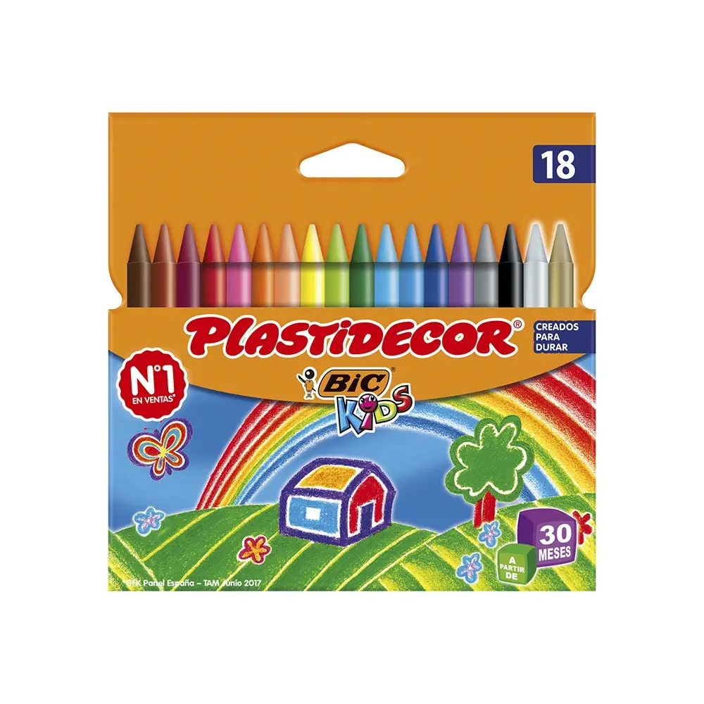 El estuche Bic Kids Plastidecor incluye 18 ceras de colores variados, perfectas para niños a partir de 30 meses. Son extra resistentes, ligeras y no manchan ni manos ni ropa. Fáciles de afilar, permiten crear dibujos precisos y coloridos, estimulando creatividad y motricidad en el día a día escolar.