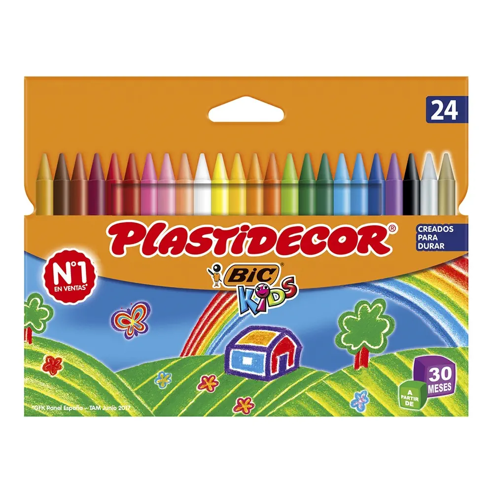 El estuche Bic Kids Plastidecor incluye 24 ceras de colores variados, perfectas para niños a partir de 30 meses. Son extra resistentes, ligeras y no manchan ni manos ni ropa. Fáciles de afilar, permiten crear dibujos precisos y coloridos, estimulando creatividad y motricidad en el día a día escolar.