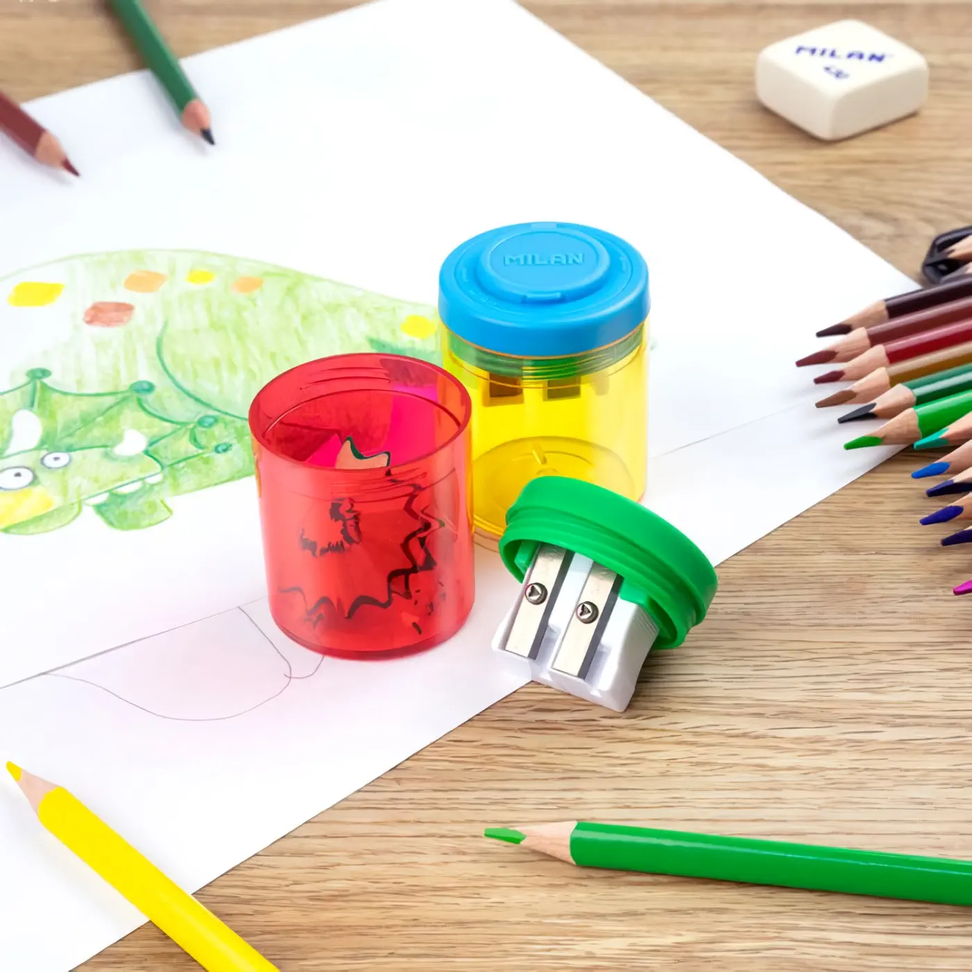 Afilador doble Milan Collection, apto para lápices estándar y maxi. Incorpora depósito de virutas, cuchilla de acero al carbono segura y resistente, y tapa con rosca para mayor comodidad. Disponible en colores surtidos. Diseño original Milan, ideal para colegio, oficina y manualidades.