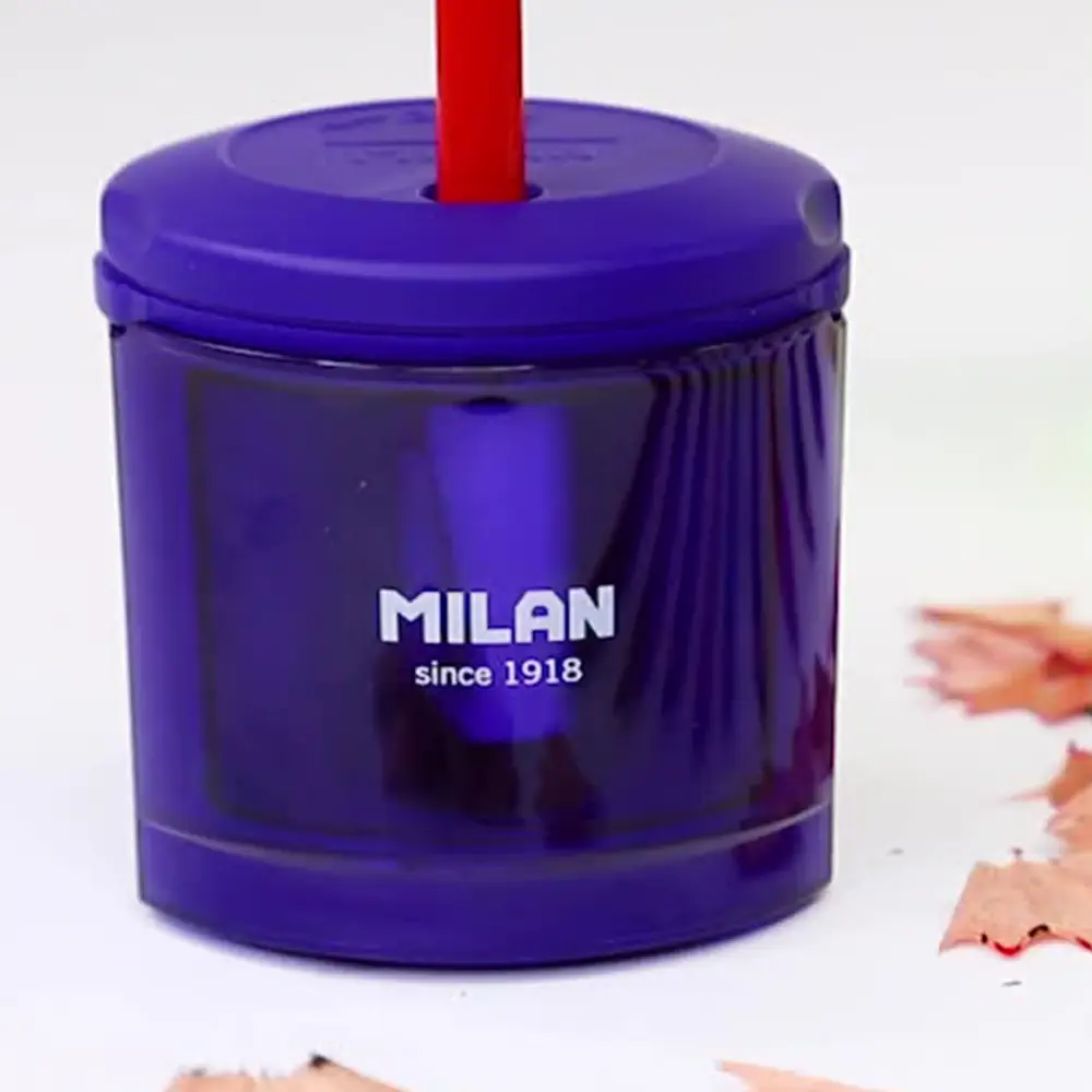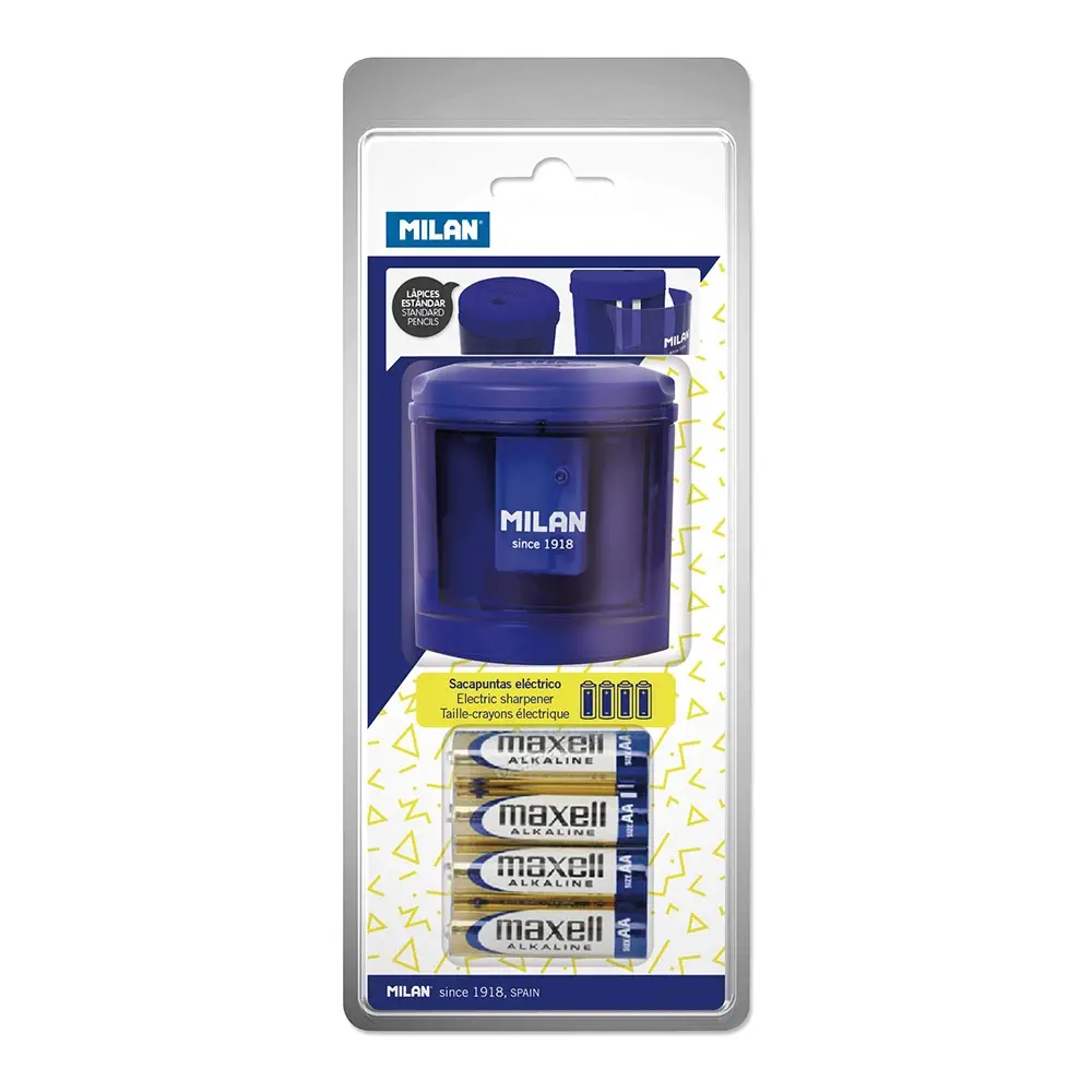 El afilador de mesa eléctrico doble Milan es válido para lápices estándar y maxi. Incorpora cuchilla de acero afilada y resistente, depósito amplio de fácil vaciado y tapa frontal extraíble. Cuenta con sistema de seguridad para evitar accidentes e incluye 4 pilas AA. Diseño azul inspirado en la colección clásica “430 since 1918”, fabricado en España. Ideal para escuela, oficina o uso profesional.