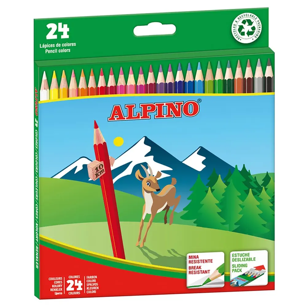 Los lápices de colores Alpino en estuche de 24 unidades combinan calidad y tradición. Su mina resistente ofrece colores vivos y uniformes, ideales para dibujar y colorear en cualquier tipo de papel. Perfectos para uso escolar, artístico o creativo en casa. Con Alpino, cada trazo inspira imaginación y diversión.