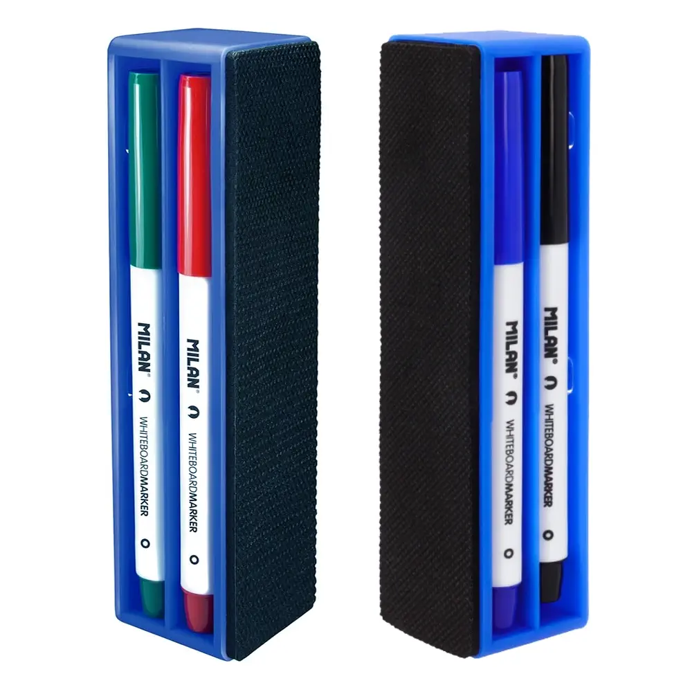 El kit Milan incluye un borrador magnético para pizarras blancas y 4 rotuladores de colores: negro, azul, rojo y verde, todos con punta redonda. El borrador se adhiere fácilmente a la pizarra, permitiendo tener los rotuladores siempre a mano y organizados. Ideal para oficina, aula o el hogar, garantiza escritura fluida y borrado rápido. Diseño compacto, práctico y funcional, perfecto para tener todo lo esencial junto y ordenado.