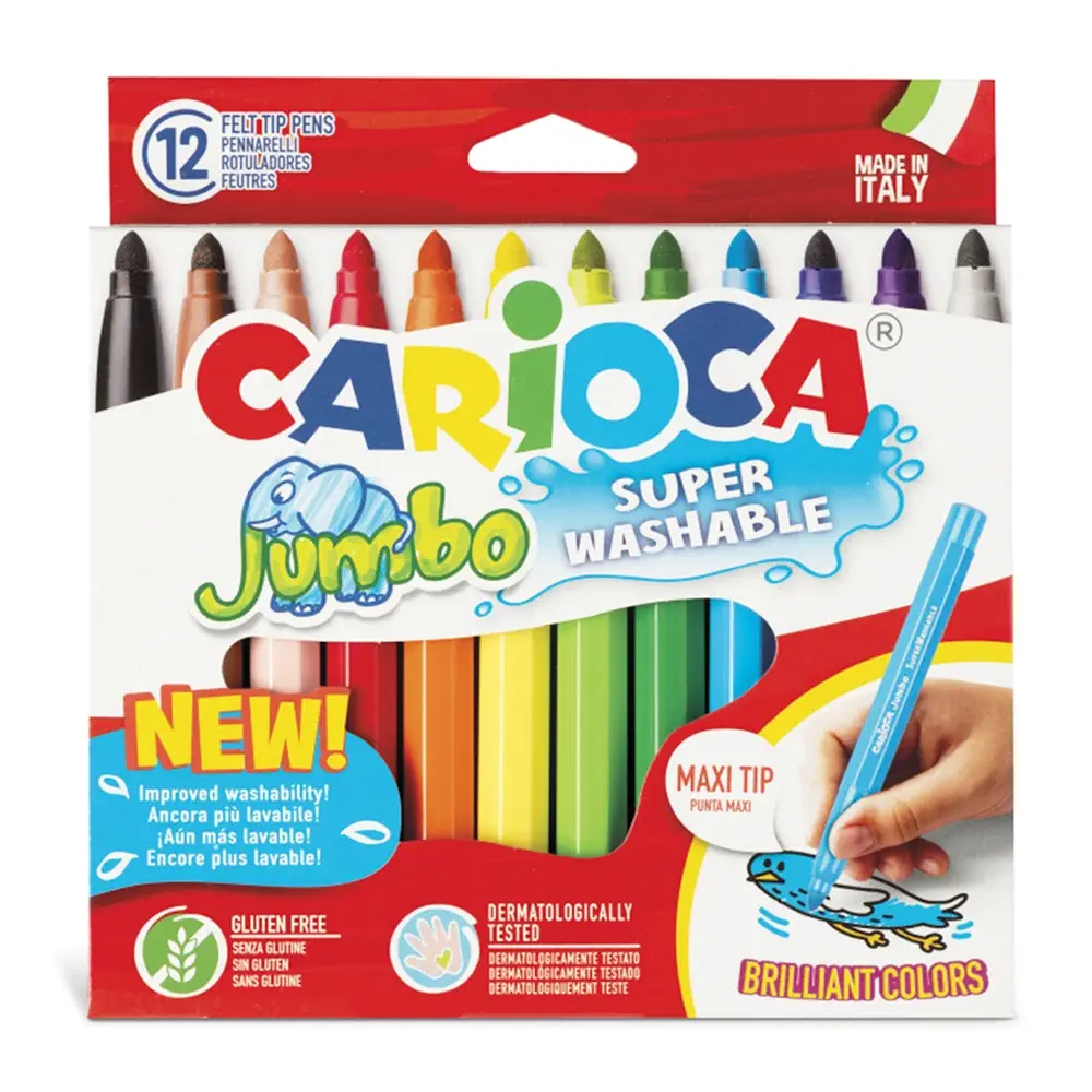 El estuche de 12 rotuladores Jumbo Carioca ofrece colores intensos y trazos anchos gracias a su punta maxi de 6 mm, bloqueada y resistente. Su cuerpo octogonal facilita el agarre, ideal para manos infantiles. La tinta es superlavable, garantizando limpieza fácil de piel y tejidos. Fabricados en Italia, perfectos para dibujar y colorear con comodidad y seguridad.