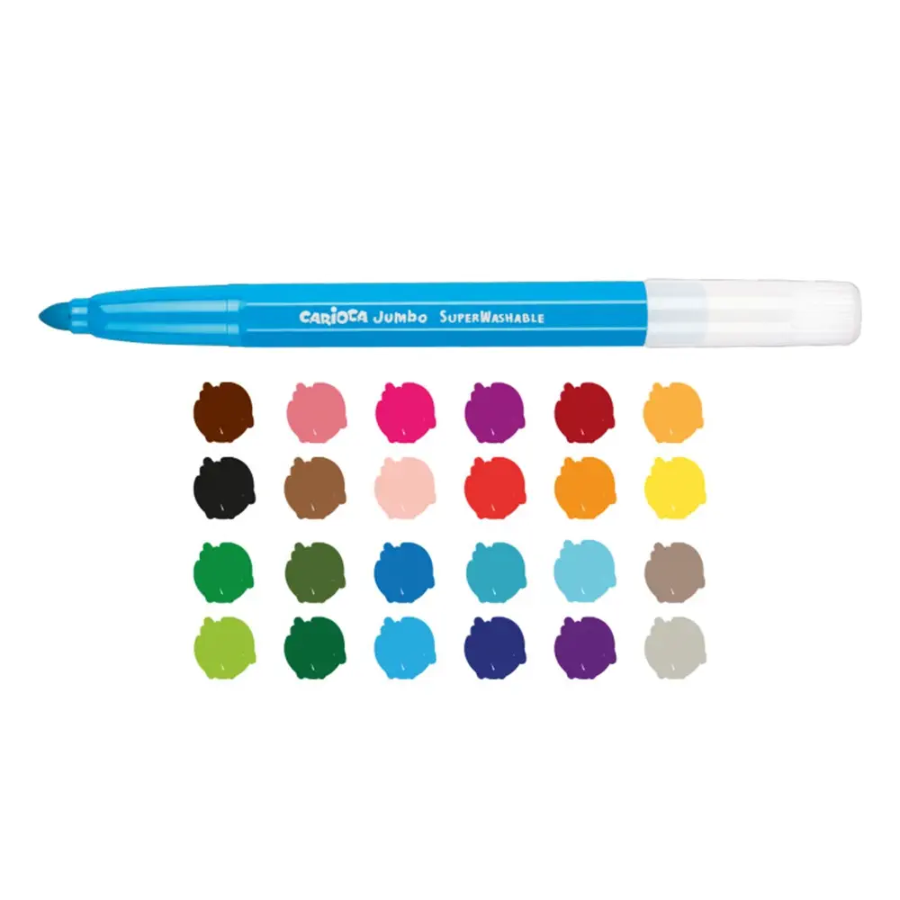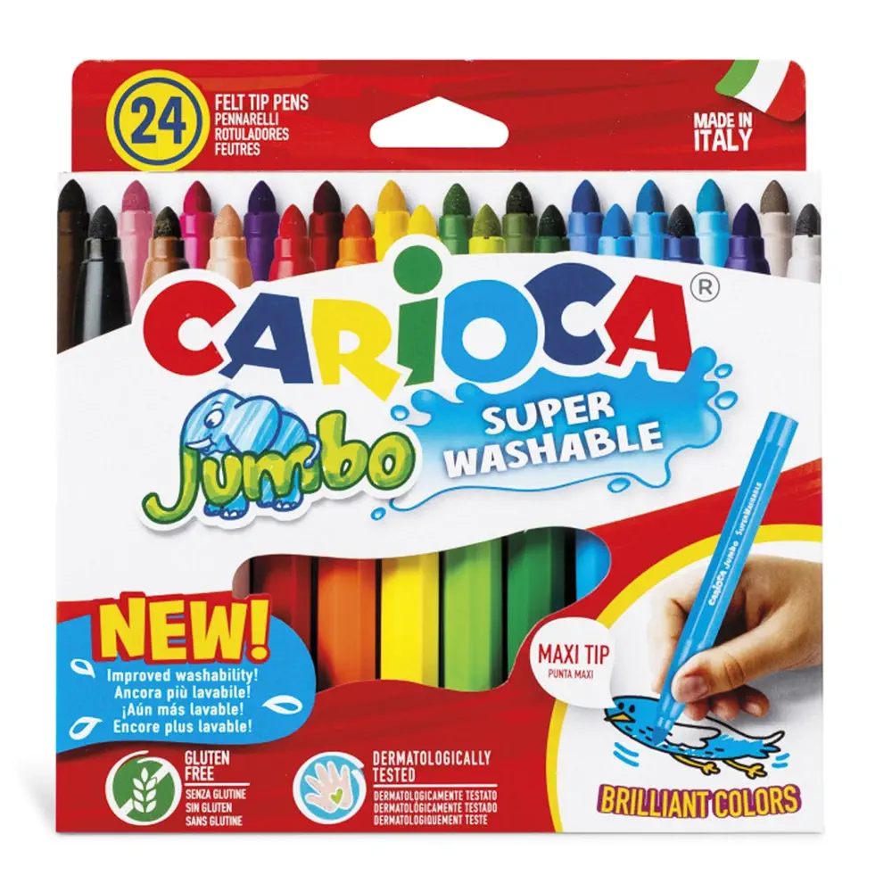 El estuche de 24 rotuladores Jumbo Carioca ofrece colores intensos y trazos anchos gracias a su punta maxi de 6 mm, bloqueada y resistente. Su cuerpo octogonal facilita el agarre, ideal para manos infantiles. La tinta es superlavable, garantizando limpieza fácil de piel y tejidos. Fabricados en Italia, perfectos para dibujar y colorear con comodidad y seguridad.