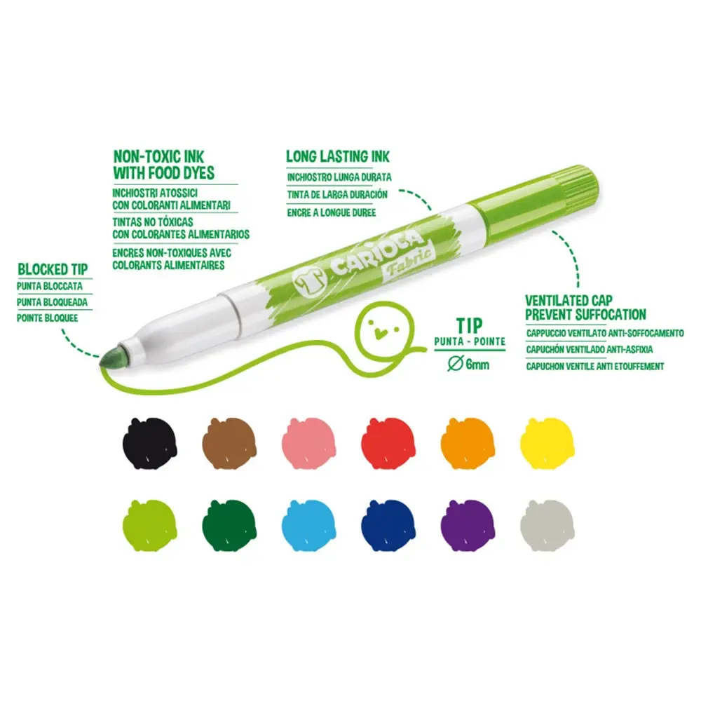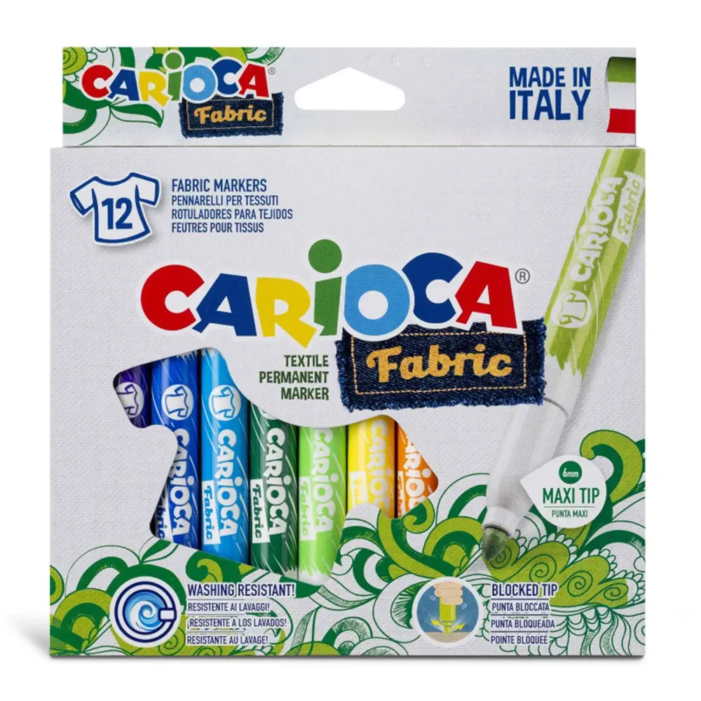 El estuche Carioca Fabric contiene 12 rotuladores especiales para tejidos. Su punta maxi de 6 mm facilita el coloreado sobre ropa y telas. La tinta se fija y vuelve indeleble tras su aplicación. Para mayor duración y brillo, se recomienda planchar por el reverso del dibujo terminado. Disfruta creando diseños originales con colores vivos y resistentes, perfectos para personalizar camisetas, bolsas y cualquier textil.