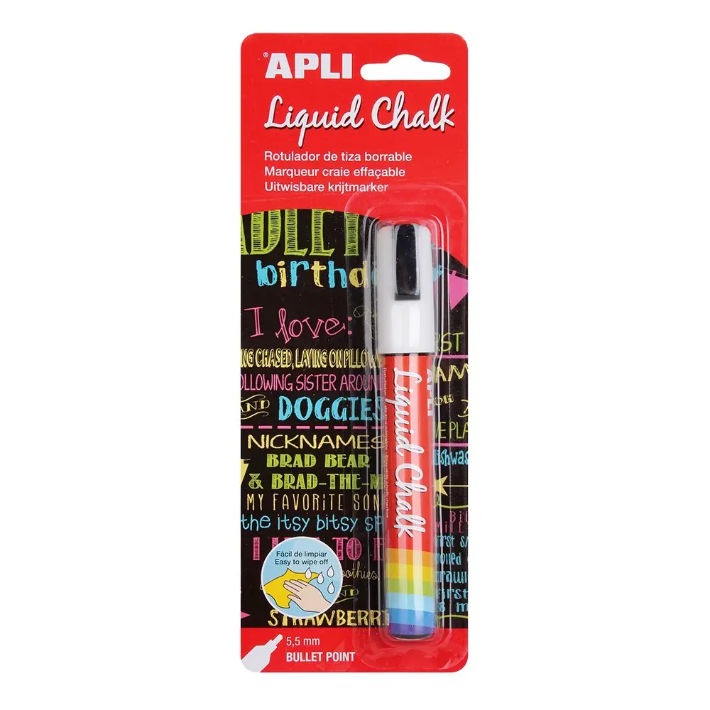 El rotulador de tiza líquida Apli blanco es la opción ideal para escribir o decorar sobre pizarras, cristal, ventanas y superficies no porosas. Viene en blister individual e incluye punta redonda fácil de usar, perfecto para textos, dibujos y señalizaciones temporales. Se borra fácilmente con un paño húmedo, ofreciendo limpieza y comodidad en cada uso. Ideal para tiendas, hostelería, oficinas o el hogar.