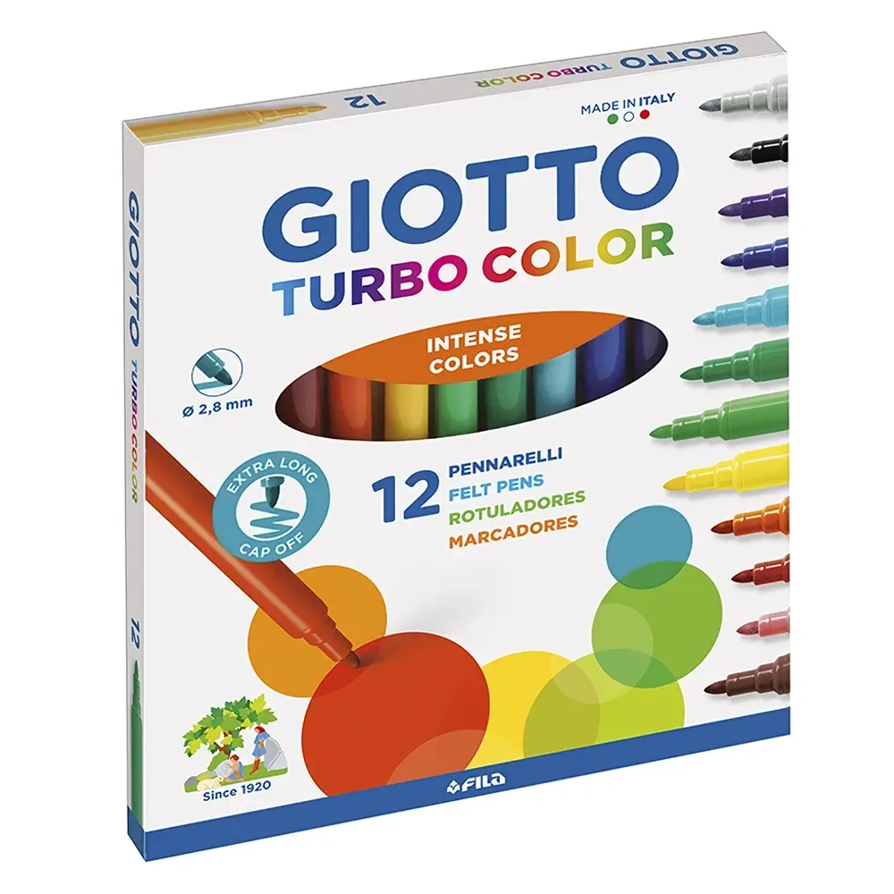 Descubre los rotuladores Giotto Turbo Color: el estuche incluye 12 colores surtidos con punta redonda de 2,8 mm, ideal para manos pequeñas. Ofrecen trazos anchos, cobertura excelente y colores vibrantes. Su tinta lavable se elimina fácilmente de manos y tejidos (agua y jabón). Punta resistente y tapa ventilada para máxima seguridad. Perfectos para fomentar la creatividad en casa o en la escuela.