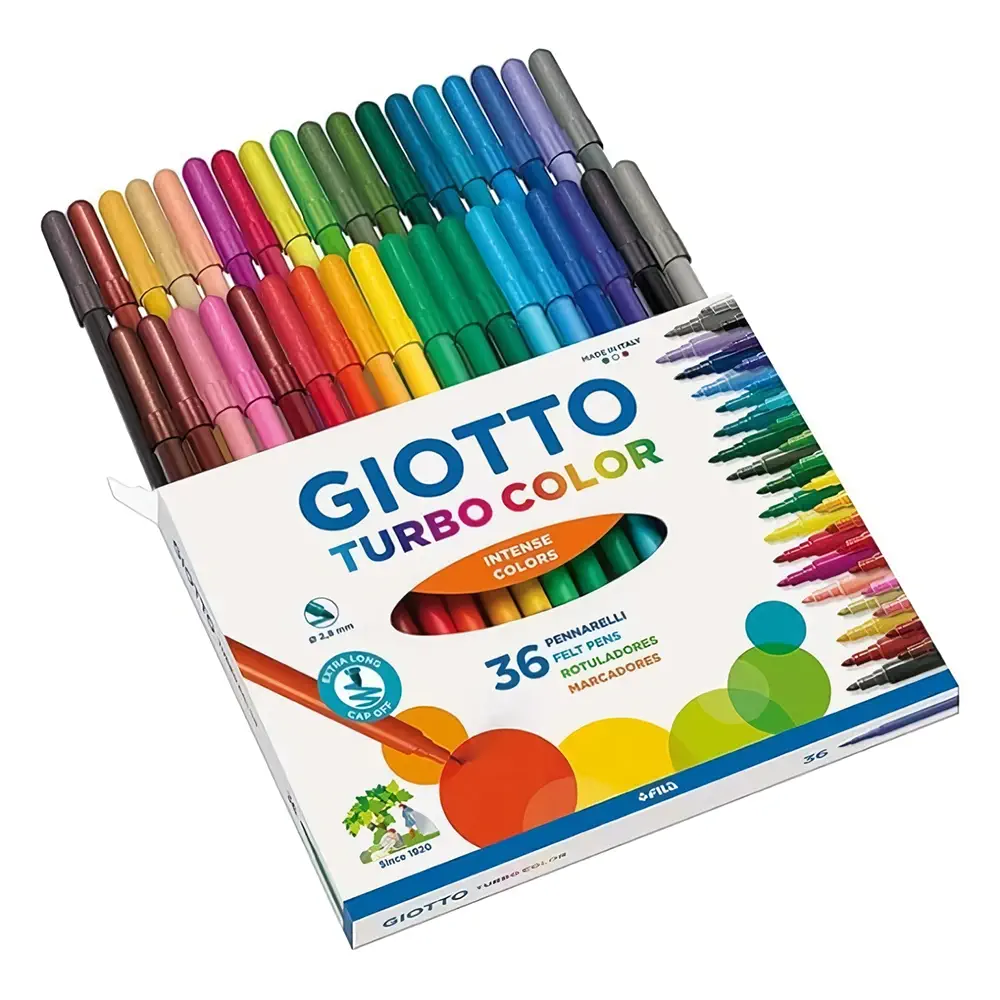 El estuche Giotto Turbo Color incluye 36 rotuladores de colores vivos y variados. Su punta redonda de 2,8 mm es robusta y segura, ideal para trazos tanto finos como anchos. Tinta lavable y fácil de eliminar de piel y tejidos. Perfectos para potenciar la creatividad de niños y adultos en el hogar, la escuela o proyectos artísticos.
