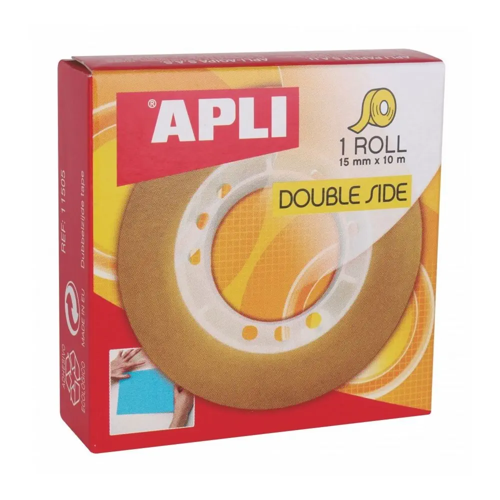 La cinta doble cara Apli de 15 mm de ancho por 10 metros de longitud ofrece adherencia extra fuerte en ambas caras, perfecta para unir papel y plástico. Su diseño transparente y corte limpio facilita el uso en manualidades o presentaciones profesionales. Compatible con porta rollos para dispensado rápido y preciso, garantiza fijaciones duraderas y removibles sin dañar superficies.