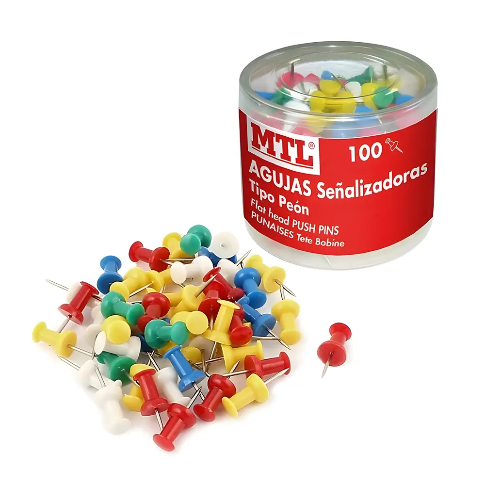 Las agujas señalizadoras MTL de colores surtidos son la herramienta ideal para fijar o señalizar documentos en paredes o pizarras de corcho. Fabricadas con materiales resistentes y puntas afiladas, garantizan un uso cómodo y seguro. Su diseño con cabezales de colores facilita la identificación y organización de tus proyectos. Se presentan en prácticas cajas de 100 unidades.
