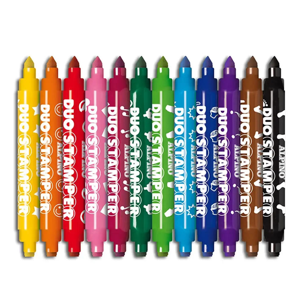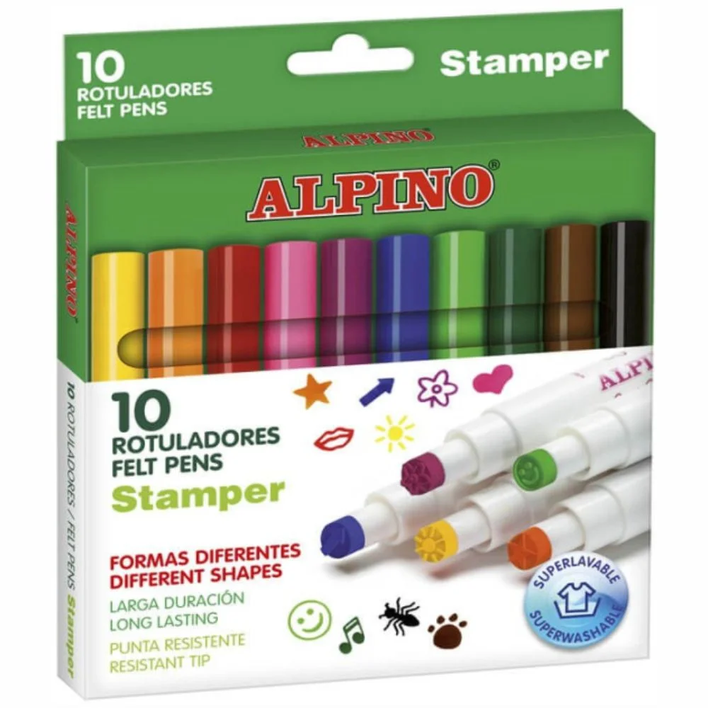El estuche de 10 rotuladores Stamper Alpino ofrece colores vivos y punta de sello para crear estampados originales en cada trazo. Son fáciles de usar y seguros para niños, ideales para decorar, dibujar y dejar volar la imaginación tanto en actividades escolares como en casa. Perfectos para fomentar la creatividad mediante juegos y manualidades.